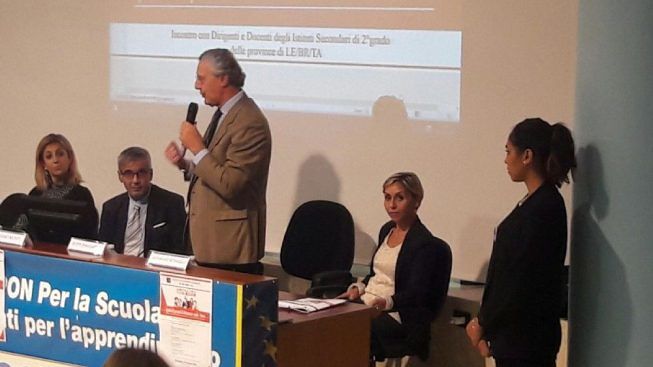 Nel pomeriggio, invece, dirigenti e docenti degli Istituti Secondari di II grado delle province di Lecce, Brindisi e Taranto, hanno partecipato ad un incontro formativo per discutere con il professor Monti dei nuovi percorsi di Alternanza Scuola – Lavoro. Assieme a loro, il Dirigente Scolastico Silvia Madaro Metrangolo, Vincenzo Nicolì, Dirigente USR Puglia – Ufficio VI – A.T di Lecce, Fulvia Guazzone di Strategic Community e Giuseppe Seracca, Guerrieri Presidente regionale dell’Associazione Dimore Storiche Italiane.