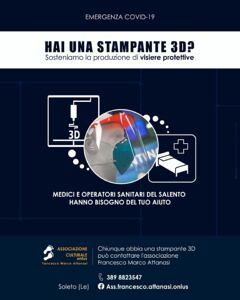 L’Associazione Francesco Marco Attanasi è alla ricerca di makers in possesso di stampante 3D, in particolare nel territorio confinante il comune di Soleto. Chiunque abbia stampanti in 3D può contattare l’Associazione al numero 389 8823547