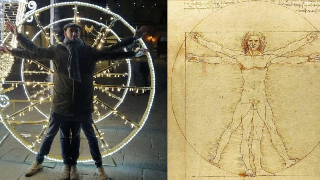 «Francè, mettiti davanti alla ruota con le braccia larghe tipo Uomo Vitruviano che ti faccio una foto». Le intuizioni più originali iniziano sempre per caso o quasi sempre. Così è stato anche per Roberto che la notte di Natale ha chiesto ad un suo amico di posare davanti ad una delle luminarie allestite in città fingendo di essere il protagonista del disegno più famoso al mondo di Leonardo da Vinci. Un gioco, uno scatto da condividere sui social. Nulla in più.
