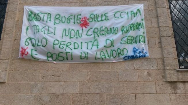 “Camere di commercio: sì alle riforma, no alla chiusura”; “Basta bugie sulla CCIAA. I tagli non creano risparmi sulla perdita di servizi e posti di lavoro”. Sono questi i due slogan, firmati Rsu (Rappresentanza Sindacale Unitaria), che sono contenuti nei due striscioni che capeggiano sui muri dell’entrata principale dell’ente camerale leccese. Secondo l’organizzazione sindacale se si va avanti con queste riforme si genera un vero e proprio terremoto occupazionale. Non tanto e non solo per i dipendenti, che sono 65, ma anche per gli oltre 50 giovani che fanno capo al Consorzio servizi associati (Csa) e ai dieci lavoratori delle Aziende speciali. Il taglio delle entrate stabilito per decreto è del 35, 40 e 50 per cento e sarà spalmato su tre anni, ma il countdown è già iniziato: dal primo gennaio il bilancio subirà la prima drastica sforbiciata. Attualmente il diritto annuale garantisce all’ente leccese un introito di 10 milioni di euro. I costi da tagliare sono quantificati in circa tre milioni e mzzo.