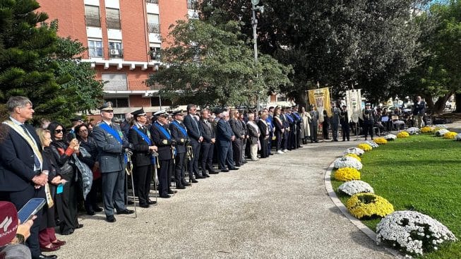 La manifestazione è proseguita, poi, alle ore 10.45in Piazza Italia, dove, dopo lo schieramento, il picchetto d’onore e l’alzabandiera, si è proceduto con la deposizione di una Corona di alloro presso il monumento ai caduti.