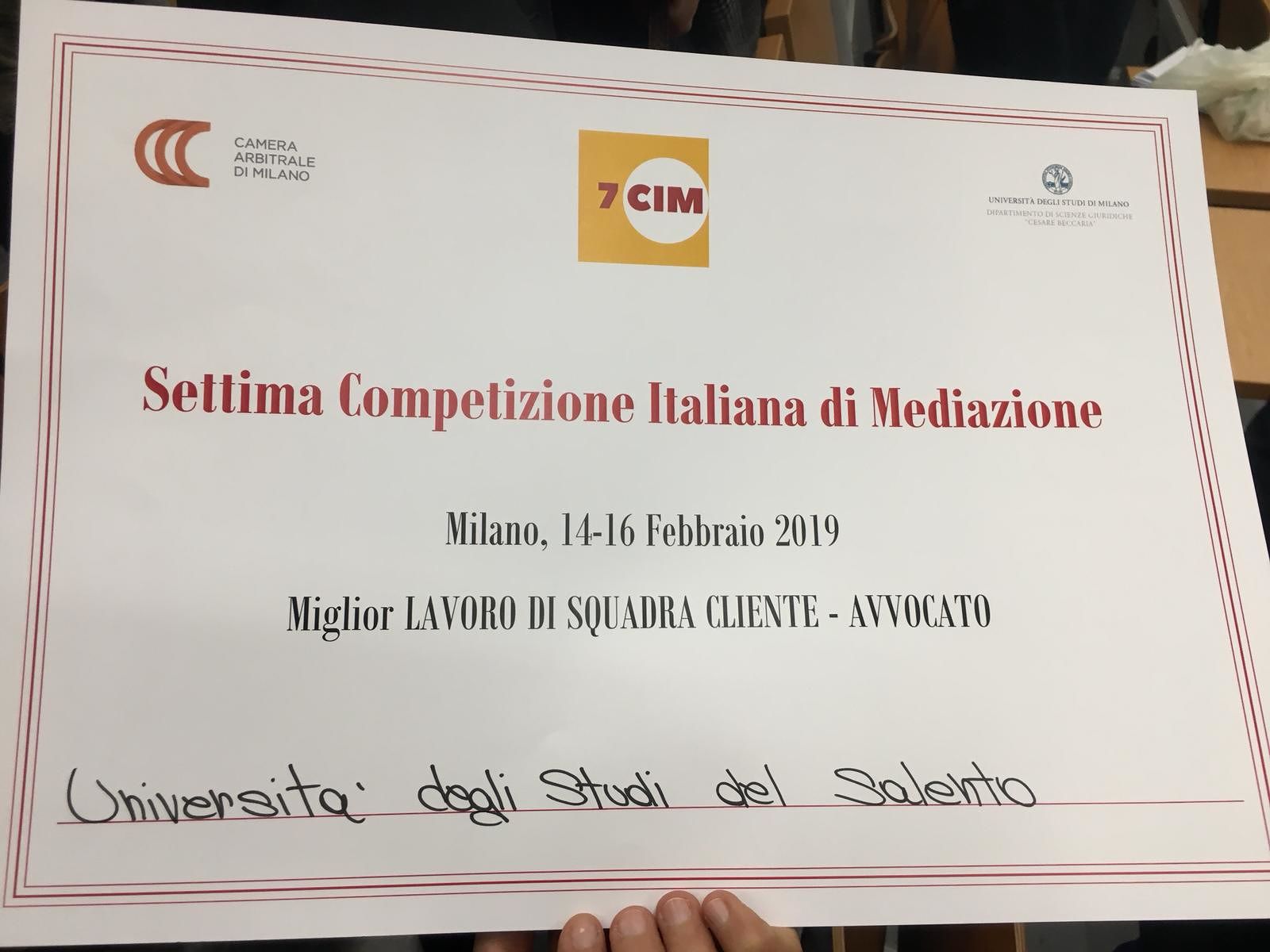 Porta a casa risultati eccellenti la squadra salentina di aspiranti mediatori che tra il 14 e il 16 febbraio ha sfidato gli studenti provenienti da vari atenei italiani in occasione della Competizione italiana di mediazione (Cim7) ospitata a Milano. La gara, giunta alla sua settima edizione, è organizzata dalla Camera arbitrale di Milano insieme all’Università statale.