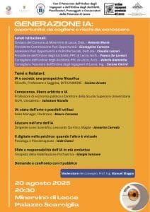 Il 20 agosto 2025, alle 20:30, lo storico Palazzo Scarciglia di Minervino di Lecce diventerà la location ideale per il convegno “Generazione IA: opportunità da cogliere e rischi da conoscere” organizzato dalla Commissione pari opportunità con la collaborazione dell’Amministrazione comunale. Un momento di riflessione e confronto che unisce filosofia, scienza, psicologia ed etica, con il patrocinio dell’Ordine degli Ingegneri e dell’Ordine degli Architetti della Provincia di Lecce.