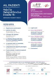 Nella giornata di sabato 16 novembre a Lecce, presso il Grand’Hotel Tiziano e dei Congressi, a partire dalle ore 10.00, si terrà il Seminario Pazienti – Medici dedicato alle Malattie Mieloproliferative Croniche Philadelphia Negative organizzato da AIL – Associazione Italiana contro Leucemie, linfomi e mieloma con il patrocinio di Fondazione GIMEMA.