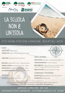 Ai saluti istituzionali di Giuseppe Tanisi, Sindaco di Taviano, Fernando Calò, Dirigente Scolastico dell’Istituto Comprensivo di Taviano, Gianna Guido, Segretaria Generale della Cisl Scuola di Lecce, Silvia Madaro Metrangolo, Dirigente Scolastica dell’IIS ‘Antonietta De Pace’ di Lecce, Annalena Manca, Dirigente Scolastico dell’IISS ‘Don Tonino Bello’ di Tricase – Liceo Artistico ‘Nino Della Notte’ di Poggiardo, Paolo Aprile, Dirigente Scolastico dell’IPSEO ‘Aldo Moro’ di Santa Cesarea Terme, Giovanni Casarano, Dirigente Scolastico dell’IISS ‘Egidio Lanoce’ di Maglie, seguirà l’introduzione del Segretario Generale della Cisl di Lecce, Ada Chirizzi, alla tavola rotonda coordinata e presieduta da Valentina Pascali, Responsabile dello Sportello Lavoro della Cisl di Lecce e Riccardo Rucco, Presidente dell’ente di formazione Asesi.