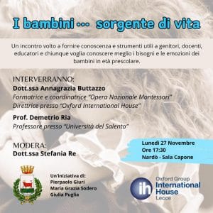 L’obiettivo è informare e confrontarsi, con genitori, docenti ed educatori, su temi che riguardano i bambini in età prescolare. L’iniziativa coincide con le attività della Giornata Mondiale dei diritti dei bambini, che si celebra il 20 novembre. I principali argomenti di discussione saranno i bisogni educativi speciali e le emozioni dei bambini, nel rispetto delle diversità, perché ogni bambino è unico e speciale. Interverranno Annagrazia Buttazzo, formatrice e coordinatrice dell’Opera Nazionale Montessori e direttrice dell’Oxford International House e Demetrio Ria, docente dell’Università del Salento.