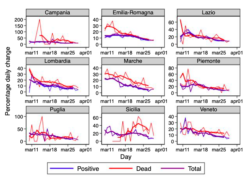 “Va notato – scrive l’autore dello studio – che il numero dei casi in questo momento non è pari al numero degli abitanti del Paese attualmente infettati, ma solo a quello di coloro che sono risultati positivi al test. La quantità di persone attualmente infettate è probabilmente maggiore di un intero ordine di grandezza. Inoltre, la proporzione fra i casi positivi e il numero di persone infettate in ogni momento dato non va considerata costante, perché i criteri e l’intensità dei test variano nel tempo e fra regioni”.