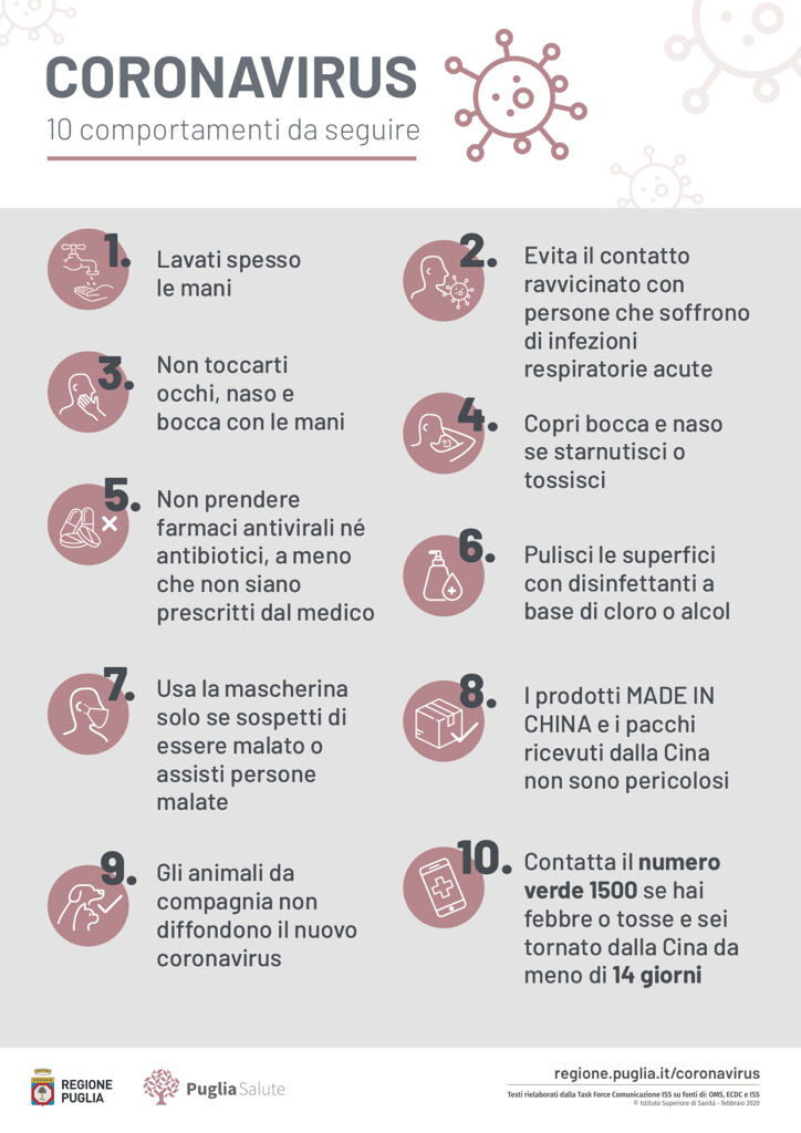 Non presentarsi mai al Pronto Soccorso. La prassi, come detto, è quella di contattare il proprio medico di medicina generale per segnalare il rientro da una regione dove si sono registrati casi di contagio o se sono presenti sintomi (febbre, tosse secca, mal di gola, difficoltà respiratoria). In alternativa c’è il Servizio Igiene e Sanità Pubblica del Dipartimento di Prevenzione dell’Azienda Sanitaria Locale territorialmente competente, a Lecce in Viale Don Minzoni, 8.