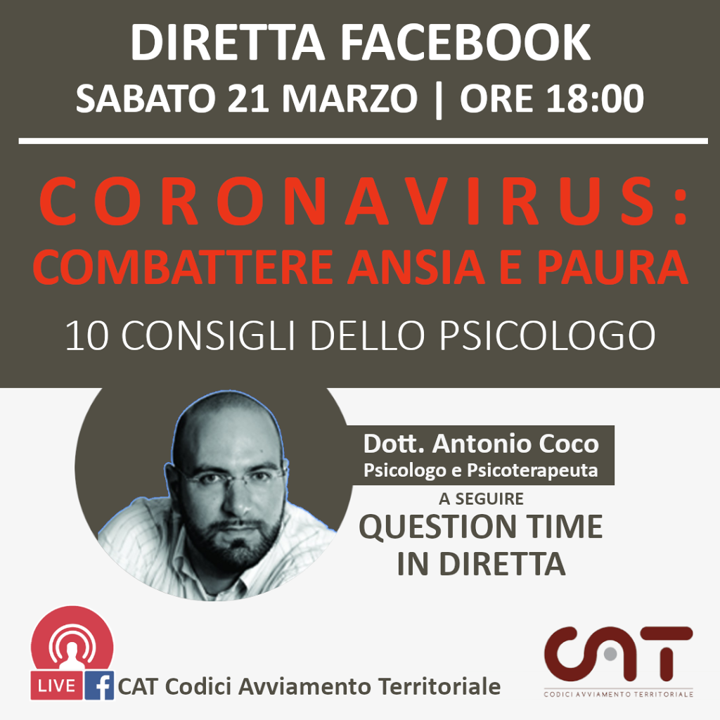 Sabato 21 Marzo, alle ore 18:00, sulla pagina Facebook di CAT – Codici di Avviamento Territoriale, si terrà l’evento online “Coronavirus: combattere ansia e paura. 10 consigli dello psicologo”. Una diretta, tenuta dallo Psicologo e Psicoterapeuta Antonio Coco, per imparare ad affrontare e gestire il malessere psicologico ed emotivo che tutti stiamo soffrendo in questo delicatissimo periodo. Dieci consigli per intrecciare un filo diretto con la comunità e per tenersi per mano, sebbene virtualmente. Uno spazio della diretta sarà riservato, inoltre, alle domande del pubblico, sempre in tempo reale e sempre in collegamento con lo Psicologo.