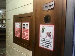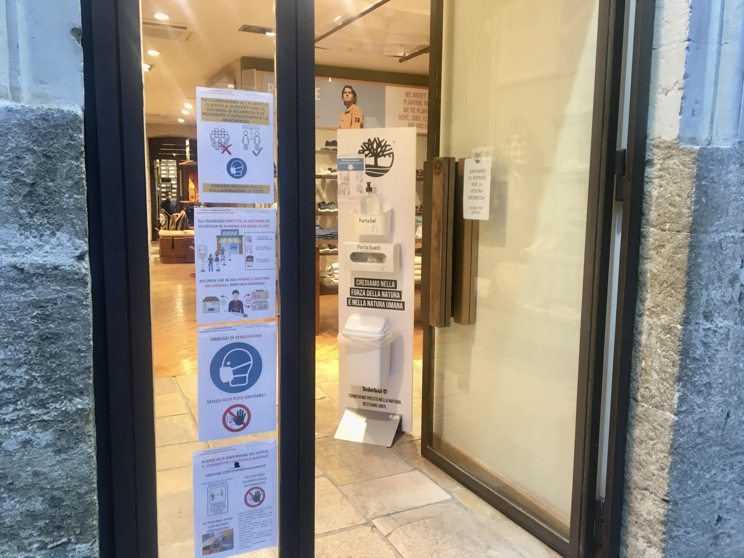 All’ingresso di ogni locale gel disinfettante, invito ad indossare la mascherina, qualcuno distribuisce anche i guanti monouso. Sulle vetrine i manichini passano in secondo piano: la prima cosa che attira l’attenzione è il lungo elenco di regole da seguire.