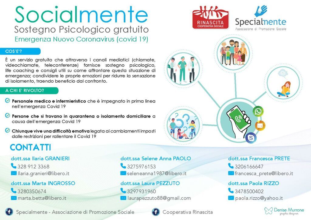 Il panico, la preoccupazione, la difficoltà ad adattarsi al nuovo stile di vita imposto dalle ‘regole’ volute dal Governo per frenare la diffusione del covid-19 sono alcune delle (tantissime) conseguenze provocate dall’emergenza scoppiata quando il Coronavirus partito da Wuhan ha ‘contagiato’ l’Italia. Per questo Rinascita, una cooperativa sociale di Copertino e Specialmente, un’associazione di promozione sociale hanno attivato «SocialMente» un servizio di supporto psicologico gratuito.