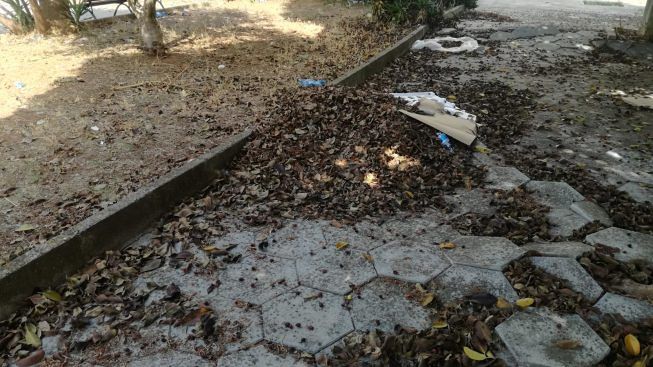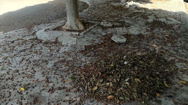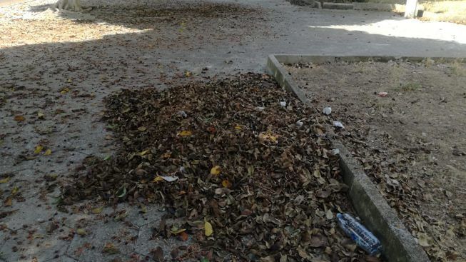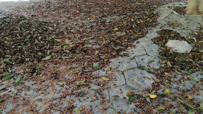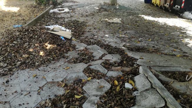 Lo spettacolo, effettivamente, non è dei più piacevoli agli occhi. Il tappeto di foglie a terra è solo il primo segno dell’incuria a cui si accompagna un manto di bacche che hanno ricoperto interamente la pavimentazione. Impossibile camminare se non facendo slalom tra il terreno disconnesso e la presenza di ‘frutti’ caduti al suolo.
