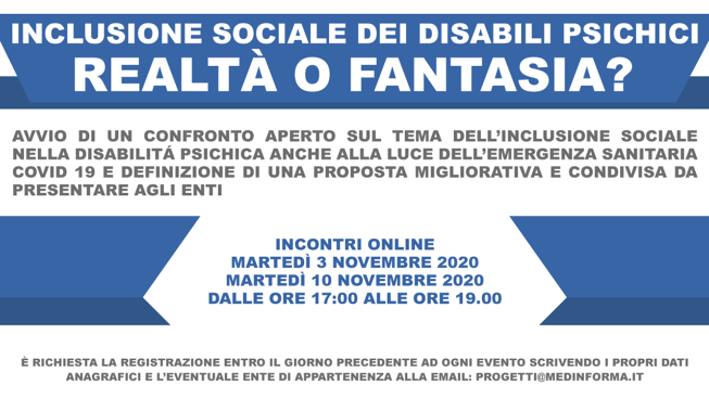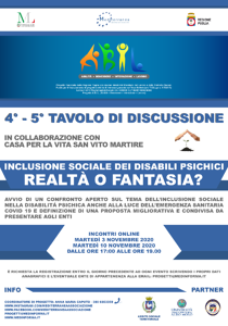 Mediterranea Associazione per Lo Sviluppo Locale, nell’ambito di A.B.I.L. (progetto finanziato dalla Regione Puglia con risorse del Ministero del Lavoro e delle Politiche Sociali, Avviso 1-2018 Puglia Capitale Sociale)  in collaborazione con la struttura residenziale a media intensità assistenziale-sanitaria  La Casa per la Vita S.Vito Martire, organizza due tavoli virtuali di discussione interamente dedicati al tema dell’inclusone dei disabili psichici ai tempi del Covid 19, gli incontri sono orientati alla definizione di una proposta migliorativa dei servizi all’uopo istituiti e all’elaborazione di un documento condiviso da sottoporre agli Enti Territoriali di competenza.