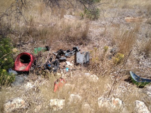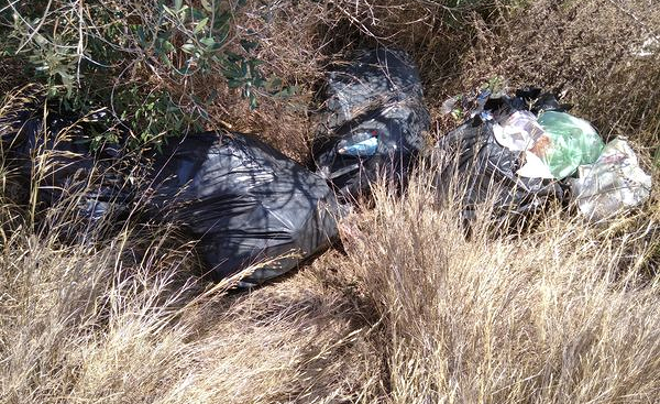«4 sacchi neri pieni di immondizia, 3 gomme di camion, una di auto e una di bicicletta, materiale edile vario, pezzi di uno scooter smontato (presumibilmente rubato), piatti e bicchieri in ceramica, un ferro da stiro e, dulcis in fundo, due lastre di amianto. Questa una minima parte di quanto, il 28 luglio u.s., ho trovato nel mio terreno in zona macchie e che, dopo aver fatto denuncia contro ignoti, ho raccolto e smaltito personalmente. 4 sacchi neri che ho dovuto aprire e differenziare con le mie mani (e non vi dico lo schifo) e un camion carico di tutto il resto da portare in discarica a mie spese».