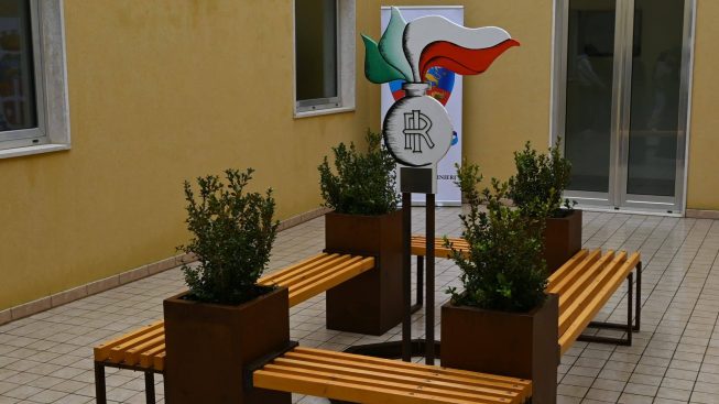 Ha forma quadrilatera: simbolo di solidità, equilibrio e confini chiari; l’unione di legno (vita e natura) e ferro (forza e resistenza) richiama l’equilibrio tra l’accoglienza umana e la fermezza istituzionale dell’Arma e infine è composta da quattro parallelepipedi che fungono da fioriere e supporto per le sedute in legno, disposte in modo dinamico per favorire l’incontro e l’inclusione.