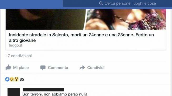 Questi i fatti: un utente della pagina di un noto giornale online ha condiviso la notizia del terribile incidente mortale avvenuto sulle strade del Salento che è costato la vita a due giovanissimi. Avevano un futuro davanti, ma le pagine bianche tutte da scrivere si sono macchiate di sangue in una fresca notte di agosto. Un dramma dinanzi al quale si dovrebbe rimanere in silenzio, per rispetto del dolore della famiglia, di un fidanzato che ha visto morire la sua dolce metà e degli amici che hanno perso i compagni di avventure. Ha scelto di aprire bocca, invece, un altro utente, dimostrando con poche parole la mostruosità che è in grado di raggiungere l’animo umano. «Son terroni, non abbiamo perso nulla» scrive. Non aggiungeremo altri commenti.