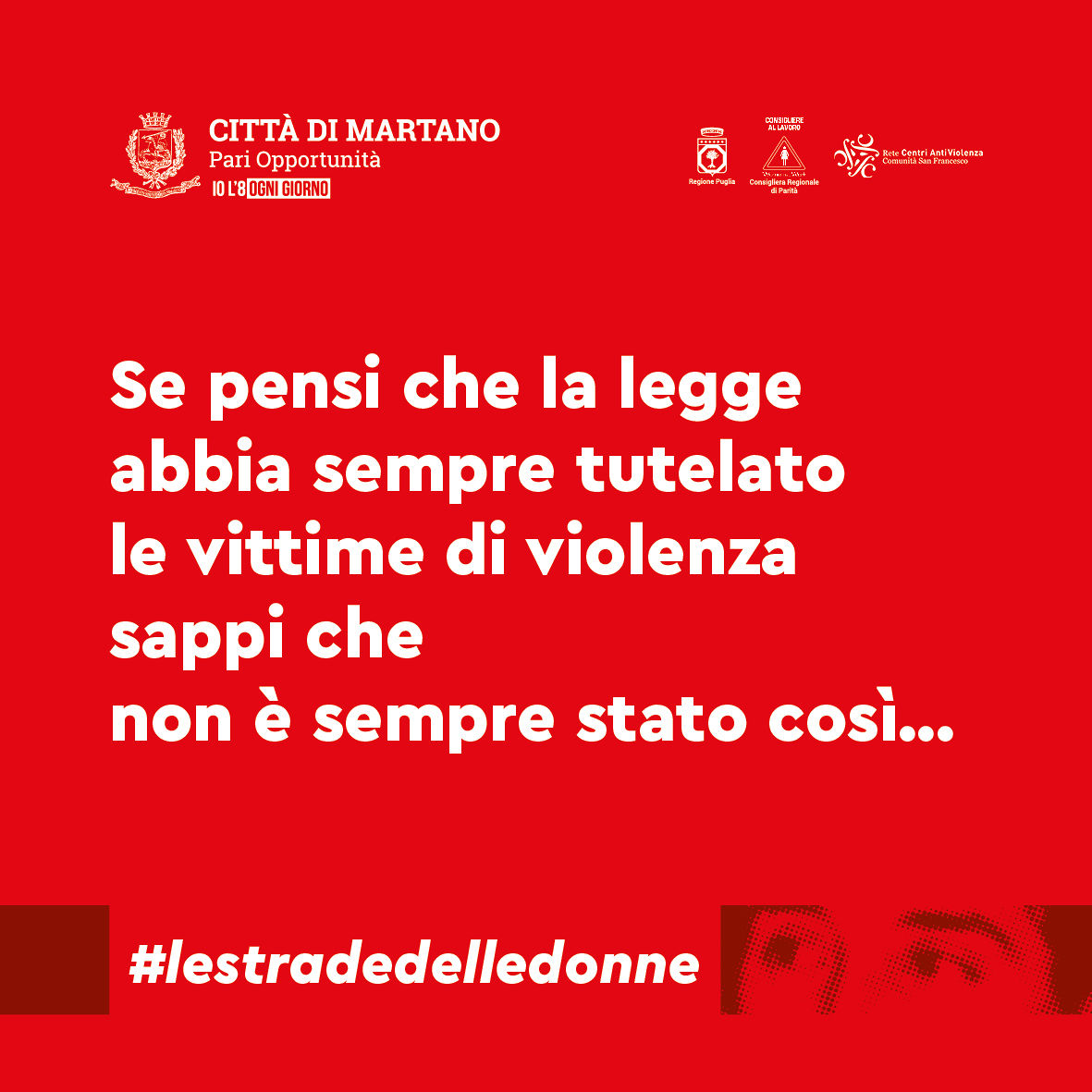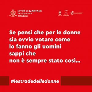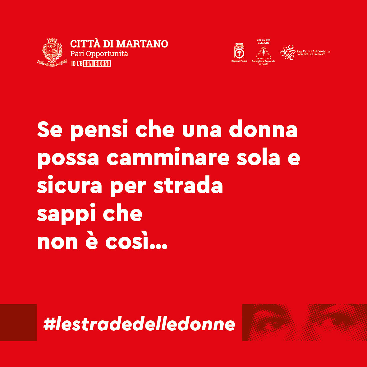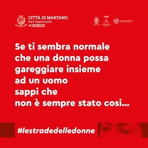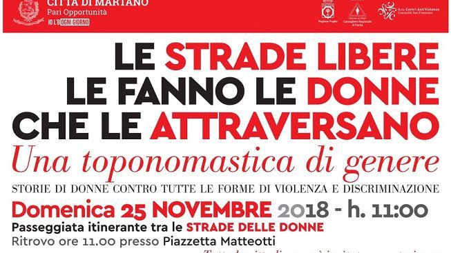 L’appuntamento con l’evento, fortemente voluta da Giulia Durante, Consigliera alle Pari Opportunità del Comune di Martano e realizzata insieme a tutta l’Amministrazione Comunale, è per domenica 25 novembre alle ore 11.00 . Con il coinvolgimento delle donne martanesi, delle realtà associative locali e con il prezioso contributo dei ragazzi e delle ragazze del CCRR di Martano inizierà il “viaggio” tra le strade delle donne con le loro storie e testimonianze. Un esperimento di toponomastica di genere, quello di «le strade libere le fanno le donne che le attraversano».