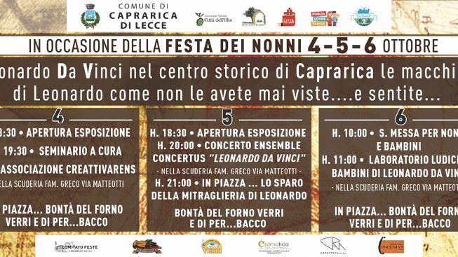 Sarà un weekend all’insegna di cultura e tanta curiosità. In occasione della festa dei nonni, a Caprarica di Lecce si festeggia in maniera particolare: il 4, 5 e 6 ottobre saranno le macchine di Leonardo Da Vinci del Museo di Galatone ad essere ospitate dal comune salentino.