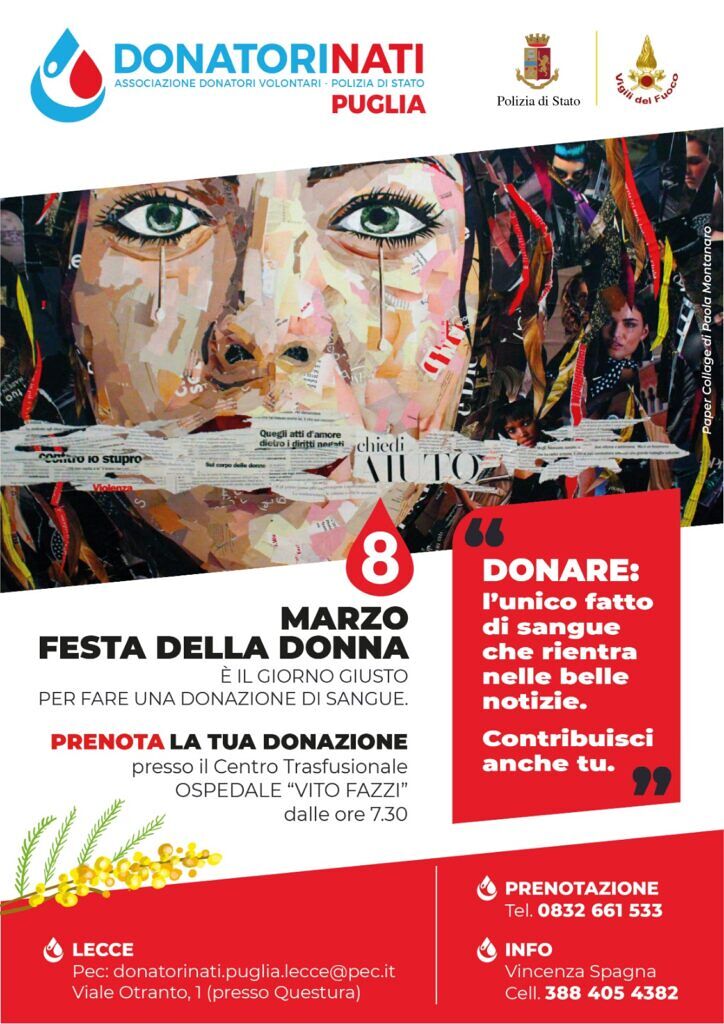 Alle 8.00 in punto, le donne della Polizia di Stato e dei Vigili del Fuoco si daranno appuntamento al centro trasfusionale dell’Ospedale “Vito Fazzi” di Lecce per donare il sangue, un piccolo-grande gesto di solidarietà che può salvare una vita. Sono tantissime le persone che hanno bisogno di una trasfusione. E quella sacca per loro rappresenta una speranza. Madrina dell’iniziativa la dr.ssa Sandra Meo, 1° dirigente presso la Questura di Lecce.