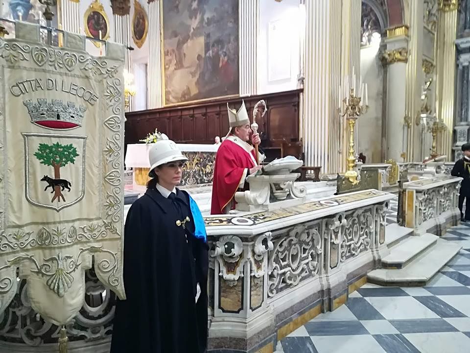 Qualche goccia di pioggia non ha certamente spaventato gli agenti della Polizia Locale di Lecce che, questa mattina, hanno celebrato San Sebastiano, loro Santo Protettore, come da tradizione. Dalle ore 10.30, infatti, presso il Duomo di Lecce, si è svolta la cerimonia religiosa, officiata dall’Arcivescovo Michele Seccia, dove hanno partecipato gli agenti della Municipale leccese, dirigenti e personalità di spicco della politica salentina.