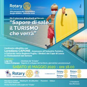 Organizzato dal Rotary Club Tricase Capo di Leuca, presieduto dalla dottoressa Luigia Morciano, questo pomeriggio a partire dalle ore 18, il forum “Sapore di sale…il turismo che verrà” coinvolgerà sindaci e operatori turistici del Capo di Leuca.