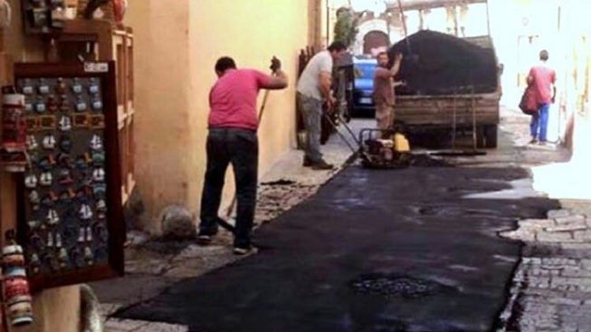 Il tam tam che si è creato sui social ha fatto il resto: in men che non si dica un gruppo di cittadini si è dato appuntamento in via De Pace per bloccare gli operai impegnati nei lavori per il passaggio della fibra ottica. Salvo scoprire, poi, che i basoli erano già stati rimossi da un pezzo e che la nera lingua di asfalto versata forse in maniera un po’ troppo abbondante era stata “pensata” per rendere meno pericoloso il tratto, soprattutto ai pedoni. Certo è che il bitume, versato anche sulle pietre ancora esistenti, non è passato inosservato sollevando – è il caso di dirlo – un polverone.