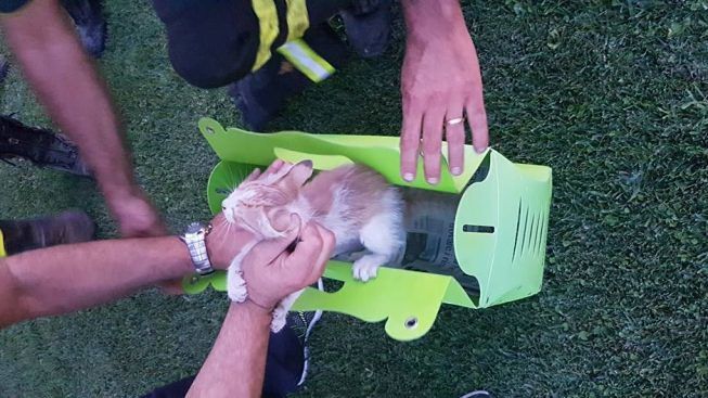 Alcune squadre e pattuglie arrivano intorno alla rotatoria e, con una scala e con non poca fatica, grazie alla collaborazione di tutti il gatto è stato portato in salvo.