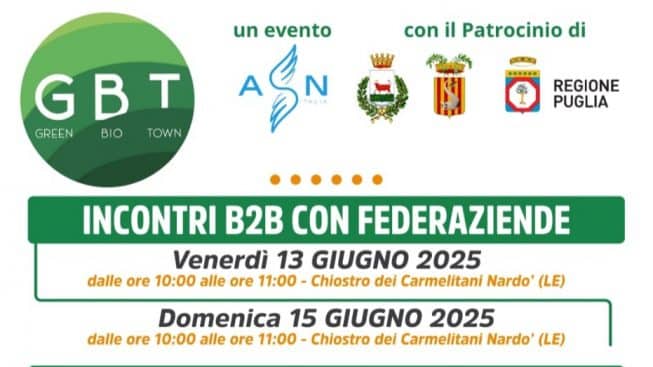 È in arrivo un evento di grande rilevanza per la sostenibilità e lo sviluppo del territorio salentino: il Green Bio Town di Nardò, giunto alla sua terza edizione. La manifestazione, organizzata dall’Associazione Angeli per la salute naturale con il patrocinio di Provincia di Lecce, Comune di Nardò e Presidenza del Consiglio della Regione Puglia, si propone come un punto di riferimento nazionale per natura, ambiente, agricoltura sostenibile, salute naturale ed educazione alimentare.