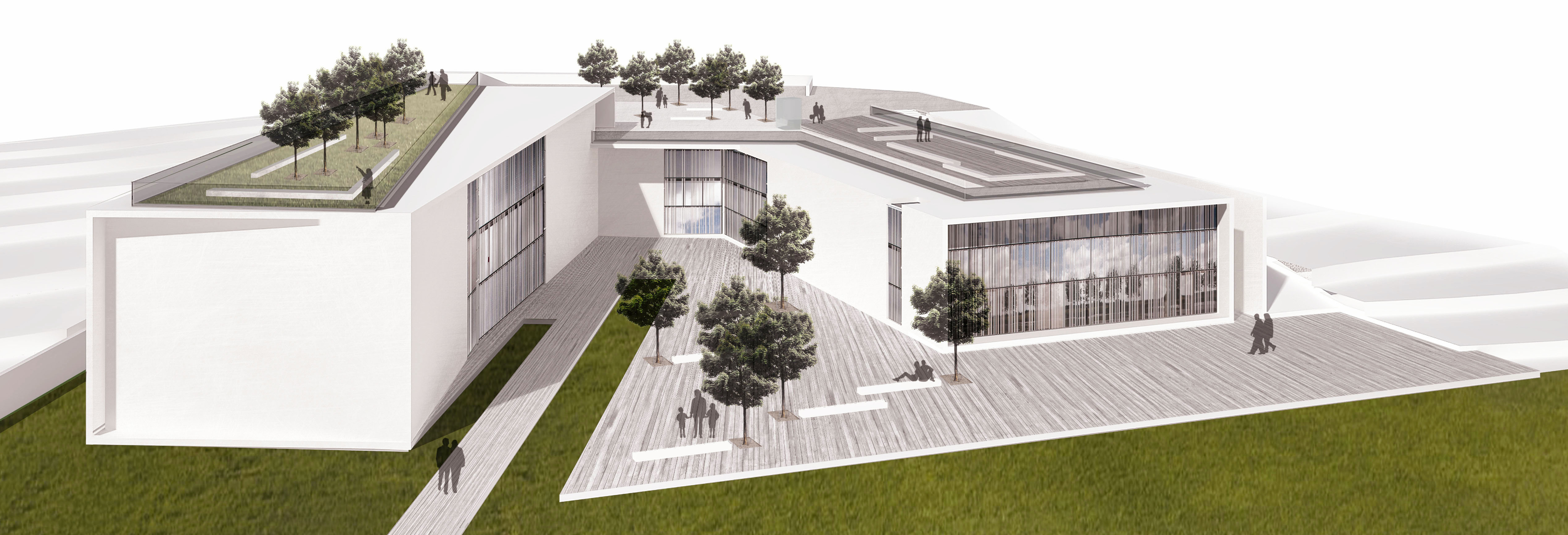 Un progetto nel progetto che sviluppa, in un’area di 14.000 mq, un impianto a corte multifunzionale dove la scatola muraria va oltre la scuola, entra nel tempo libero della comunità locale con attività aggiuntive (palestra, auditorium, biblioteca, orti botanici). Il disegno di architettura segue le curve di livello, segna la collina, disegna un belvedere pubblico, elemento di contemporaneità nel paesaggio di un polo scolastico a scala territoriale.