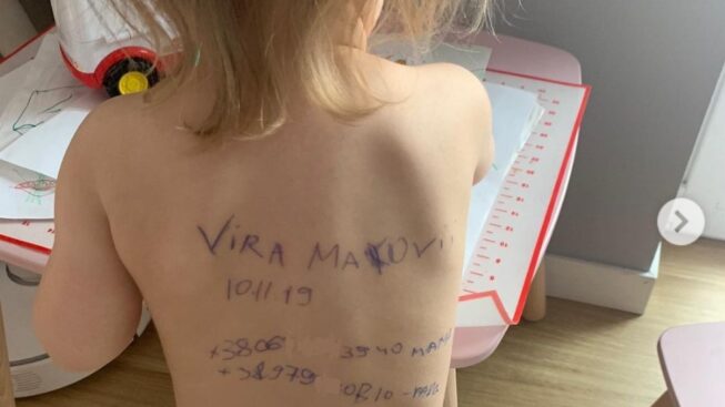 Virali le immagini dei corpi dei bambini sulla cui pelle le madri hanno scritto i contatti di parenti e amici, persone che potrebbero occuparsi dei loro piccoli nel momento in cui la violenza della guerra non dovesse risparmiarle. Sulla schiena dei bambini, come una specie di carta d’identità umana e d’urgenza anche il loro nome, come quello della piccola Vera in una foto che ha fatto il giro del mondo.