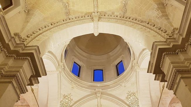 Al centro della crociera si innalza una cupola, innestata su in alto tamburo decorato con trionfi floreali di pregevole bellezza.Parzialmente integra la bellissima preziosa volta lunettata i cui fregi a festoni dialogano con l’interno di Santa Croce nei richiami simbolici (la melagrana) e di fattura. La volta lunettata, èattribuita all'architetto Marcello salentino. Il restauro degli interni ha rintracciato i pigmenti colorati all’interno delle nicchie soprastanti gli altari, ormai prive delle statue di culto, saccheggiate in tempi passati. Sono state preservate anche le patine sugli elementi lapidei obliterate da pesanti scialbature. Nel versante sinistro, che ospita gli altari di età barocca, sono stati rintracciate le punte lanceolate, firma dell’architetto Zimbalo; questo dato fa ipotizzare che parte del materiale provenisse dal cantiere di S.Angelo, altra sede degli Agostiniani, dove si attesta la presenza dello Zimbalo. Anche nel trasnsetto sono presenti due altari alle testate sormontati da nicchie che ospitavano rispettivamente le sculture di S.Andrea Avellino e San Giovanni da S. Facondo a destra, mentre nel braccio sinistro del transetto S. Cristoforo e S. Girolamo.