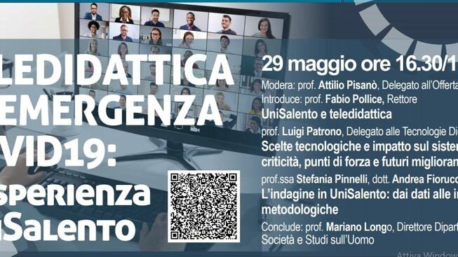Moderato da Attilio Pisanò, Delegato del Rettore all’Offerta formativa, l’incontro verrà introdotto dal Rettore Fabio Pollice e vedrà gli interventi del professor Luigi Patrono, Delegato alle Tecnologie Digitali, su “Scelte tecnologiche e impatto sul sistema didattica: criticità, punti di forza e futuri miglioramenti”; e della professoressa Stefania Pinnelli con il dottor Andrea Fiorucci su “L’indagine in UniSalento: dai dati alle indicazioni metodologiche”; conclusioni affidate a Mariano Longo, Direttore del Dipartimento di Storia Società e Studi sull’Uomo.