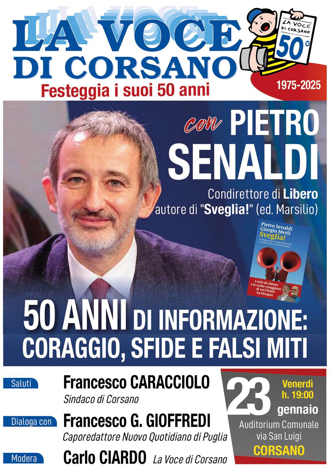 L’appuntamento, introdotto dai saluti del Sindaco di Corsano Francesco Caracciolo, vedrà la partecipazione di Pietro Senaldi, Condirettore di “Libero”, e Francesco G. Gioffredi, Caporedattore de “Il Nuovo Quotidiano di Puglia”.