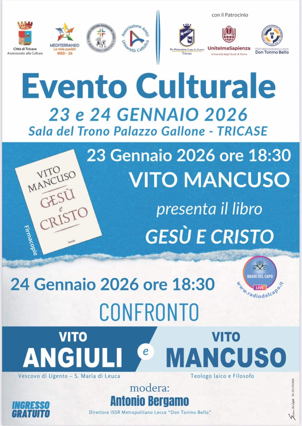 Tricase ospita Vito Mancuso per due serate di dialogo su fede, cultura e spiritualità. L’iniziativa si terrà venerdì 23 e sabato 24 gennaio, sempre alle ore 18:30, nella Sala del Trono di Palazzo Gallone.