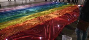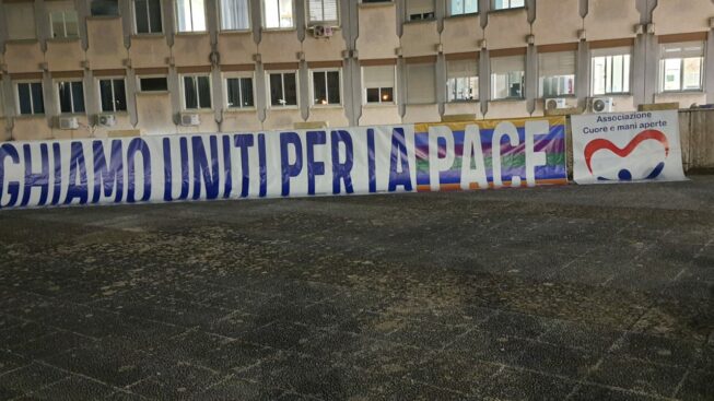 La facciata dell’ospedale si è rivestita dei colori della pace. Infatti lungo il piazzale d’ingresso sono stati stesi 7 drappi, uno per ogni colore della bandiera della pace: viola, blu, azzurro, verde, giallo, arancione e rosso e uno striscione con il messaggio “Preghiamo uniti per la Pace” .