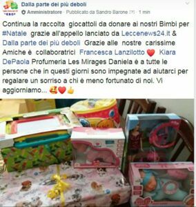 Vi avevamo chiesto di regalare una bambola ad una principessa, una bambina salentina che era sicura di non poter chiedere troppo a Babbo Natale, perché i bambini hanno il ‘sesto senso’ e sanno quando non è il caso di chiedere. Capiscono che se i genitori sono in difficoltà, forse anche Babbo Natale non se la passerà benissimo…! E invece, grazie a voi, l’associazione ‘dalla parte dei più deboli’ è riuscita a comprare una bambola per quella principessa e a regalarne altre a tutte le principesse che Sandro raggiungerà…nel principato salentino!