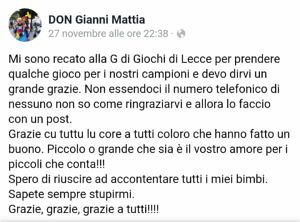 È stato bello leggere la sorpresa di Don Gianni per la vostra generosità e per questo vi diciamo grazie, ricordandovi che fino a Natale sarà sempre possibile sottoscrivere un buono regalo per un giocattolo. Don Gianni ne avrebbe ancora bisogno per i suoi ‘guerrieri’, per i suoi ‘campioni’.