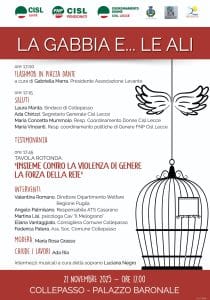 Cisl Lecce, Cisl Fnp Lecce, Coordinamento Donne Cisl Lecce, Comune di Collepasso, Associazione Culturale Collepasso Nostra e Associazione Levante uniscono le forze per un evento di sensibilizzazione e riflessione sul tema della violenza di genere, intitolato: “Insieme contro la violenza di genere. La forza della rete”.