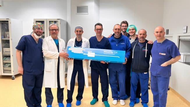 L’équipe composta da Giuseppe Colonna (Direttore della UOC di Cardiologia-UTIC ed Emodinamica), Antonio Tondo e dal Marco Mussardo, con il supporto cardioanestesiologico (Matteo Miccoli), infermieristico e tecnico, ha eseguito per la prima volta nel Polo Ospedaliero Vito Fazzi questo innovativo intervento.