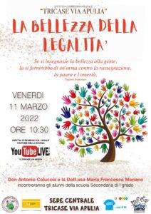 Un incontro all’insegna della legalità e della lotta alla mafia. “La Bellezza della Legalità” è il titolo dell’evento organizzato dall’Istituto Comprensivo Tricase – Via Apulia, in programma domani mattina, 11 marzo, a parte dalle ore 11 nella sede centrale della scuola. I ragazzi della scuola secondaria di I grado incontreranno due personalità molto impegnate nella lotta al crimine.