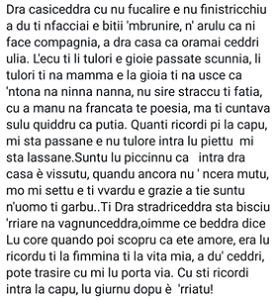 “Quella casetta, con un camino e una finestrella, dove ti affacciavi e vedevi imbrunire, un albero che gli faceva compagnia, a quella casa che oramai nessuno voleva più. L’eco dei dolori e gioie passate nascondeva quella casetta, ma anche i dolori di una madre e la gioia di una voce che intonava una ninna nanna, … Il padre stanco ritornava dal lavoro, con in mano una manciata di poesia, e alla famiglia raccontava ciò che poteva della sua giornata lavorativa. Quanti ricordi, per la testa, mi stanno passando, lasciandomi un dolore nel petto, guardandoti casetta mia, capisco che grazie a te, a ciò che ho vissuto lì dentro, sono diventato un uomo di garbo… Dalla stradina vicina, vedo arrivare una ragazzina, mamma quanto è bella, dice il cuore, quando dopo un po’ scopro che è amore, era il ricordo della Donna della mia vita, dove nessuno può entrare, per portarmela via… Con questi ricordi nella testa, il giorno dopo, oramai, è arrivato….”