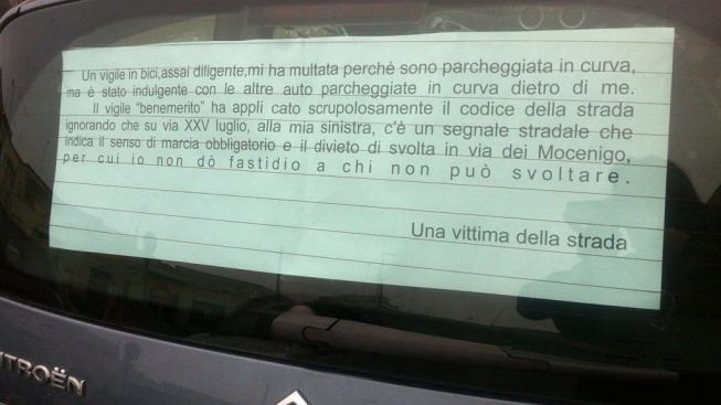 Si leggeva, in soldoni, “un vigile mi ha multata perché parcheggiata in curva, ma non ha avuto lo stesso comportamento con altri”. Insomma, il conducente – o la conducente – dell’auto proprio non ci ha visto più quando sul parabrezza ha trovato una multa e, forse in preda a quel vittimismo di cui si sentono investiti tutti coloro che ricevono un verbale, ha pensato bene di urlare la propria protesta in modo plateale, stampando un biglietto grande quanto il lunotto posteriore, celando in parole un po’ più urbane, il proprio disappunto per il gesto compiuto dal “vigile benemerito”.