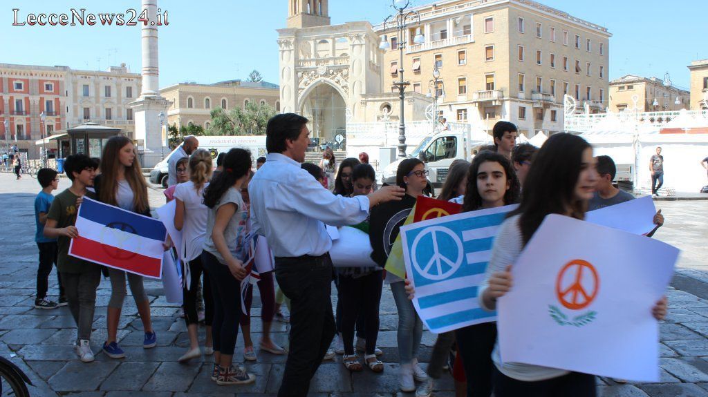 I volti giovanili che sfilano lungo la via più passeggiata dai leccesi rappresentano una speranza. Sorrisi accesi in via Trinchese. Felici. E non solo perché è terminato il periodo scoltastico, ma anche a testimonianza del messaggio fondamentale per eccellenza: quello della pace. Giusto, pertanto, iniziare dalle nuove generazioni. Sacrosanto, oltretutto, puntare alle espressioni sincere, tipiche di un’età fresca e pronta ad emergere. Ed ecco dunque che gli studenti dell’Istituto "Galilei-Costa", unitamente agli alunni del “Quinto Ennio”, comunicano al capoluogo salentino il significato di unione senza confini, tanto geografici quanto sociali. L’occasione per farlo? Semplice, il mini flashmob tenutosi stamattina tra i tratti principali del centro storico (Via Trinchese, all’altezza del teatro Apollo, e Piazza Sant’Oronzo). Singolare iniziativa – denominata "Le Bandiere di un Mondo di Pace – Ecco come i giovani vedono il futuro prossimo" – che ha incuriosito passanti e turisti intenti a svolgere le proprie attività quotidiane.