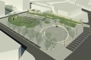 L’area a sud del Parco, per circa 300 mq, sarà dedicata al gioco di squadra, in particolare allo street basket. Il playground sarà realizzato in misto di cava stabilizzato colorato. Intorno al campo sarà disegnato un grande tabellone che riprende il vecchio gioco dell’oca. L’area da gioco sarà inoltre circondata da ampie sedute.