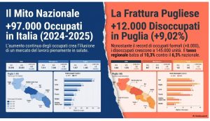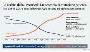 – Crollo del tempo indeterminato: in Puglia, le assunzioni stabili sono passate da 127mila a 46mila.