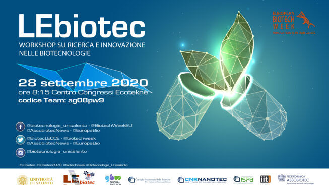 Ricerca e innovazione nelle biotecnologie sono al centro del workshop “LEbiotec”, in programma lunedì 28 settembre 2020 e organizzato dal consiglio didattico dei corsi di laurea in Biotecnologie e Biotecnologie mediche e nanobiotecnologie dell’Università del Salento, dall’Istituto di Fisiologia clinica (Cnr Ifc), dall’Istituto di Scienze delle produzioni alimentari e dall’Istituto di Nanotecnologia (Cnr Nanotec) del Consiglio Nazionale delle ricerche e dal Center for Biomolecular Nanotechnologies dell’Istituto Italiano di Tecnologia (CBN-IIT). Dalle ore 8.30 alle ore 17.30 i lavori si alterneranno in presenza nel centro congressi del complesso Ecotekne (via per Monteroni, Lecce) e online su piattaforma Teams (codice: ag08pw9) e su Facebook (@BiotecnologieUnisalento). L’iniziativa è inserita tra gli eventi della “European Biotech Week”, con il coordinamento italiano di Assobiotec; partner per la divulgazione scientifica TEaK (https://www.teaklecce.it/).