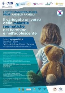 Sabato 1° giugno, a partire dalle ore 9.30, nel Salone degli Specchi del Palazzo Baronale di Monteroni di Lecce, è in programma la Lectio Magistralis del professor Angelo Ravelli, direttore scientifico dell’Istituto “Giannina Gaslini”, di Genova, sul tema: “Il variegato universo delle malattie reumatiche nel bambino e dell’adolescente”. Si tratta di uno dei reumatologi pediatri più noti a livello internazionale in ambito clinico, così come nella ricerca scientifica.