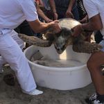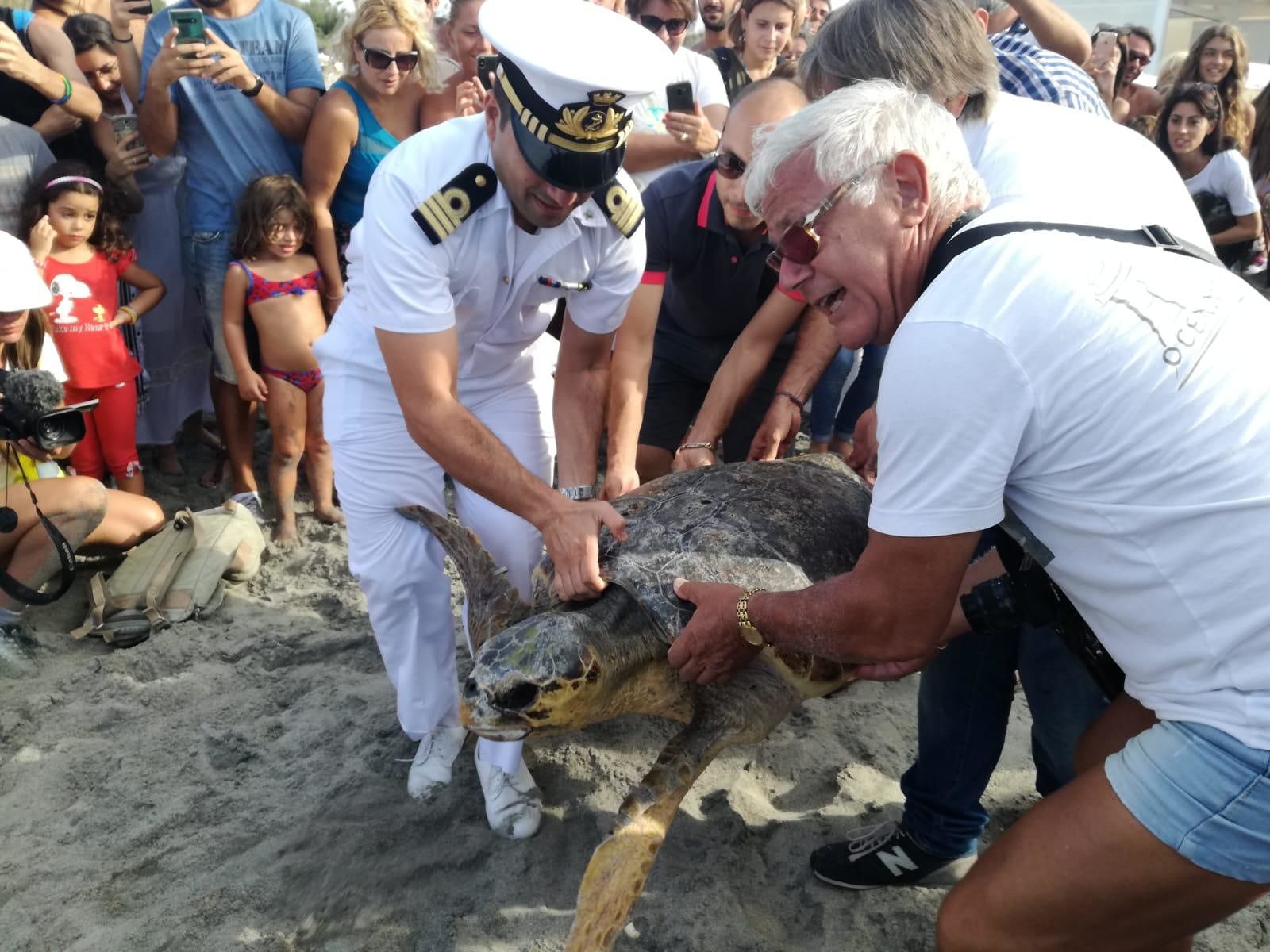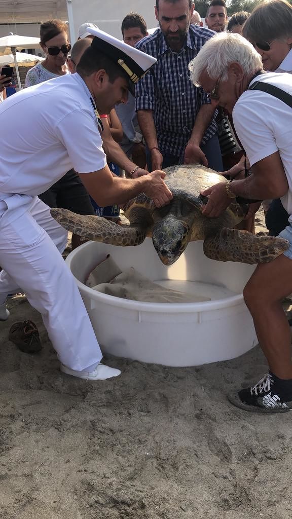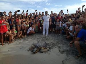Piero Carlino, esperto erpetologo e responsabile del Centro di Recupero tartarughe marine (CRTM) del Museo di Storia Naturale del Salento a Calimera, che ieri nel pomeriggio ha guidato l’operazione della liberazione, ha raccontato la storia di questo bellissimo esemplare di Caretta caretta: “La tartaruga che è stata appena liberata, quattro mesi fa era stata avvistato al largo dalla Capitaneria di Porto di Santa Maria di Leuca mentre era in galleggiamento a causa di un evidente stato di difficoltà. Oggi – ha continuato il dottore Carlino – in presenza della Capitaneria di Porto di Otranto con la quale è stata organizzata la liberazione, abbiamo potuto assistere, insieme al sindaco di Melendugno, Marco Potì e al vice-sindaco di Calimera, Antonio Montinaro, al momento emozionante in cui la “nostra” tartaruga ha preso il largo. Presente anche l’associazione svizzera Ocean Revolution (che si occupa della pulizia delle spiagge per il Comune di Melendugno) e il Club Lions Salento Territorio e Ambiente. Ci tengo a ringraziare personalmente sia Ocean Revolution che i Lions Salento Territorio e Ambiente con sede a Maglie che hanno contribuito con una donazione al nostro Museo”.