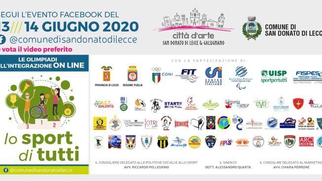 “Questa iniziativa rappresenta la migliore espressione, in questo difficile periodo, di quello che è lo sport integrato con l’auspicio di costruire insieme un gruppo che, attraverso la pratica sportiva, sviluppi e promuova la cultura dell’integrazione e della solidarietà”, con queste parole, Alessandro Quarta, primo cittadino del Comune di San Donato di Lecce, commenta la nuova iniziativa della cittadina salentina dal titolo “Lo Sport di Tutti – Le Olimpiadi dell’integrazione on line”.