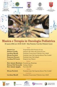 Sabato 16 marzo 2024, dalle ore 10.00 alle 12.30, presso la Sala Teatrino del Convitto Palmieri a Lecce, si svolgerà il meeting dal titolo “Musica e Terapia in Oncologia Pediatrica”, organizzato dai Lions Club Copertino Salento “Pino Cordella” e Gallipoli.